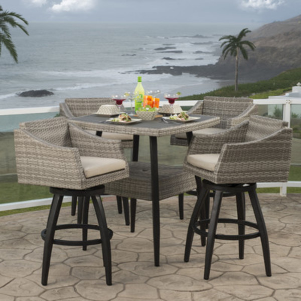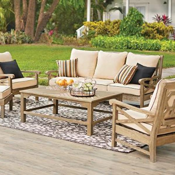 It was such a pleasure selecting pieces for your porch. I have added a furniture collection for your lounge area that includes a sofa, 2 chairs, ottomans and coffee table. I chose this collection because you have a wicker set already and a sectional that will go into the screened in area. I love the wood detail to mix in with your existing pieces to change up the look but still have a cohesive neutral feel throughout. I carried the pops of blue from your screen room with neutral tans and creams in the pillows. You will also see gray planters to liven up the space. To add a little lighting I've included a gray lantern set on the coffee table. The rugs are all durable outdoor pieces that can be easily cleaned with a hose- I think they really ground the spaces and add a nice pop of color to the otherwise neutral furniture pieces. To accompany the lounge area I added a beautiful wicker hightop set with swivel chairs. The black base works well with the railings of the deck and the wicker pulls the neutral colors from the lounge seating area. The rug is similar to the blue rugs pattern but is more neutral, you may choose to add the same rug (either one) in both areas. I'm also including an alternative dining and seating set should you want to go more bold in the seating area with a blue cushion (use the lighter colored pillows to contrast) and a 6 person rectangular dining set. I have compared prices and researched the quality of these items and I feel that they offer the best durability for your money. I hope you love your recommendations! Jenna